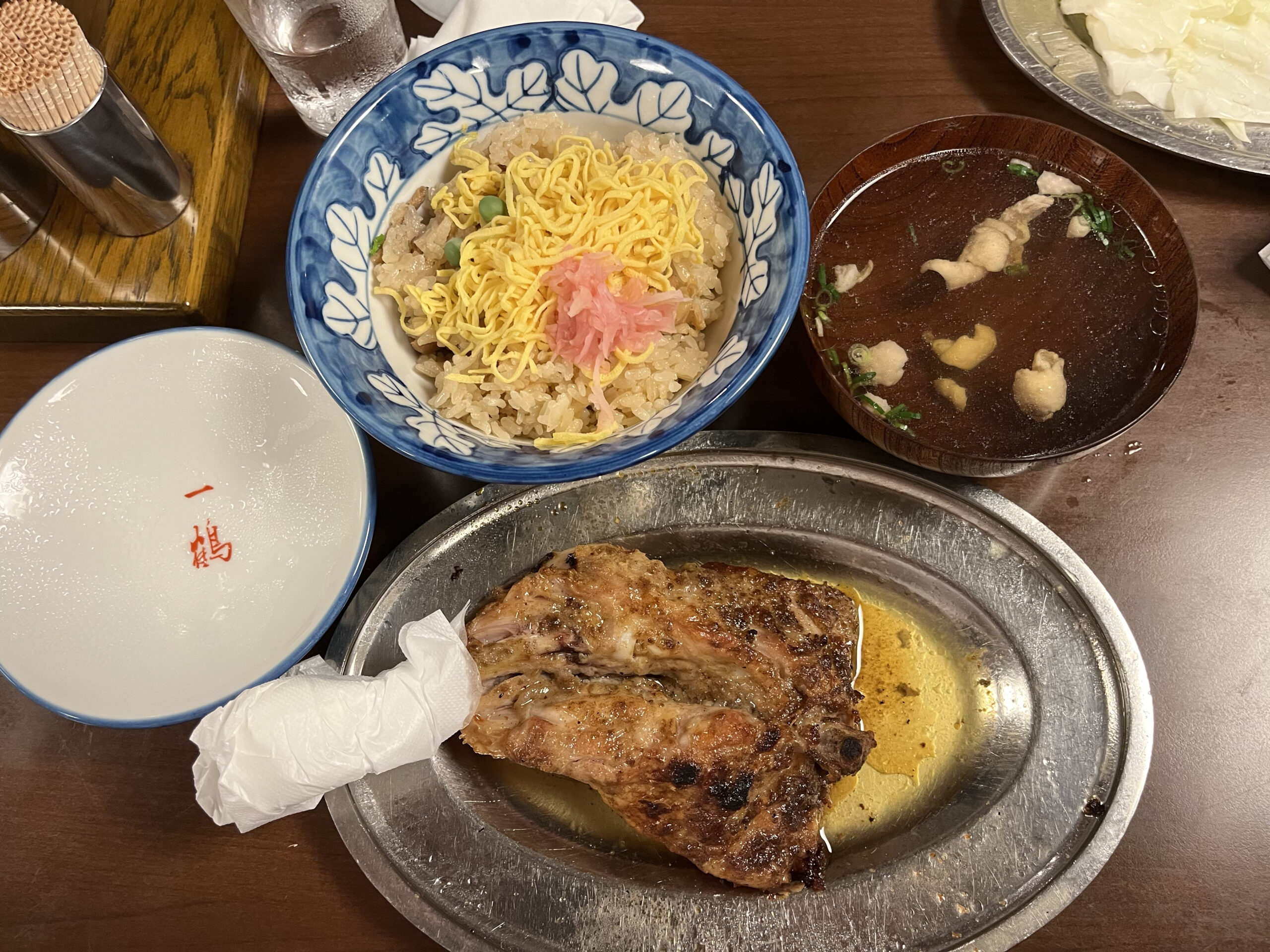 骨を手でつかんでかぶりつき、キャベツで脂をリセットし、むすびで締める——これが一鶴の食べ方の流れだ。